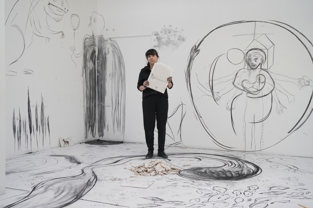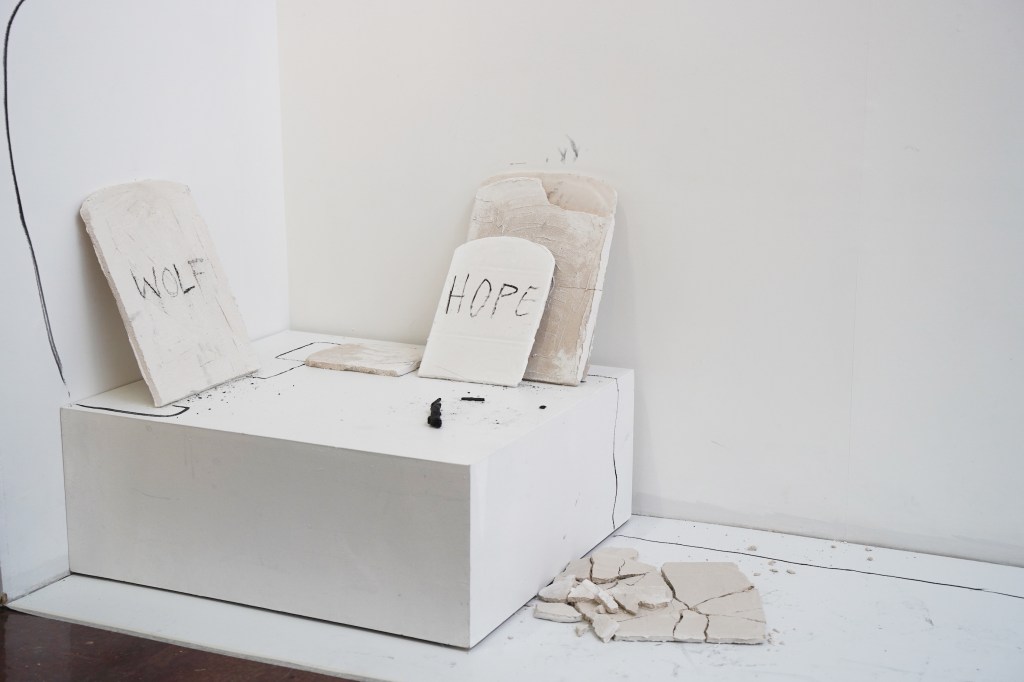 I invited the audience to reimagine, participate in the creation process, and celebrate creation as a collective practice. They used charcoal to write words of their choice on plaster tablets. During the performance, I had the agency to interpret these words into worlds.